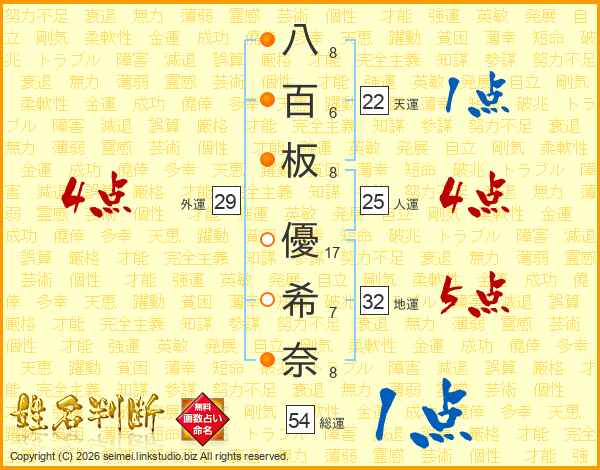 八(8画)百(6画)板(8画) 優(17画)希(7画)奈(8画)