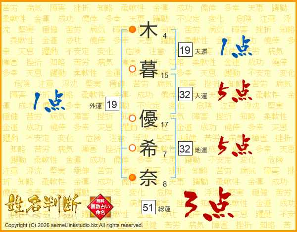 木(4画)暮(15画) 優(17画)希(7画)奈(8画)