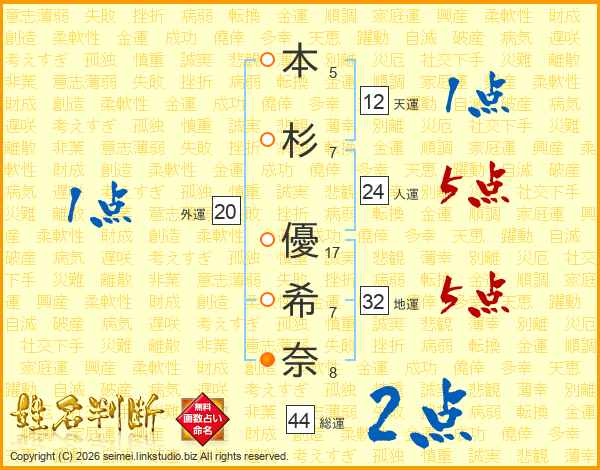 本(5画)杉(7画) 優(17画)希(7画)奈(8画)