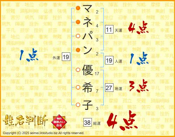 マ(2画)ネ(4画)パ(3画)ン(2画) 優(17画)希(7画)子(3画)