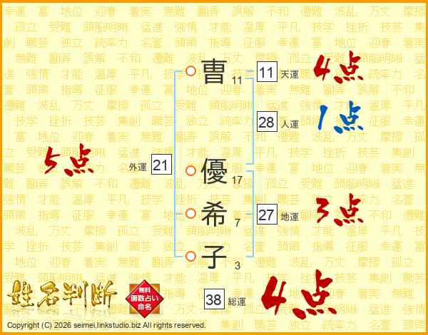 曺優希子さんの総運は38画の4点!
