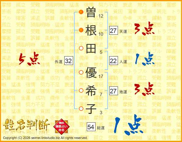 曽根田優希子さんの外運は32画の5点!