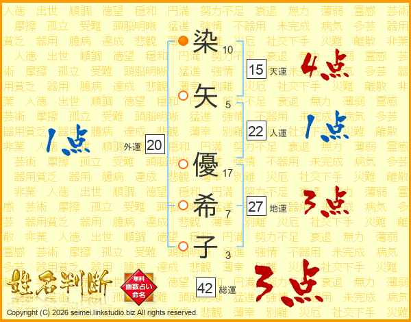 染(10画)矢(5画) 優(17画)希(7画)子(3画)