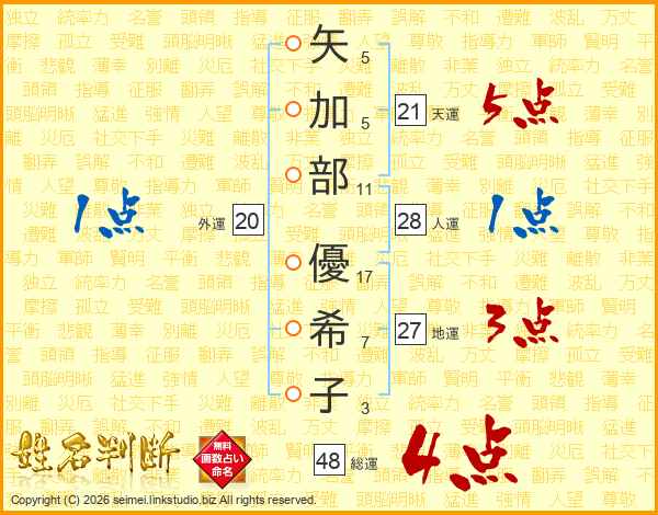 矢(5画)加(5画)部(11画) 優(17画)希(7画)子(3画)