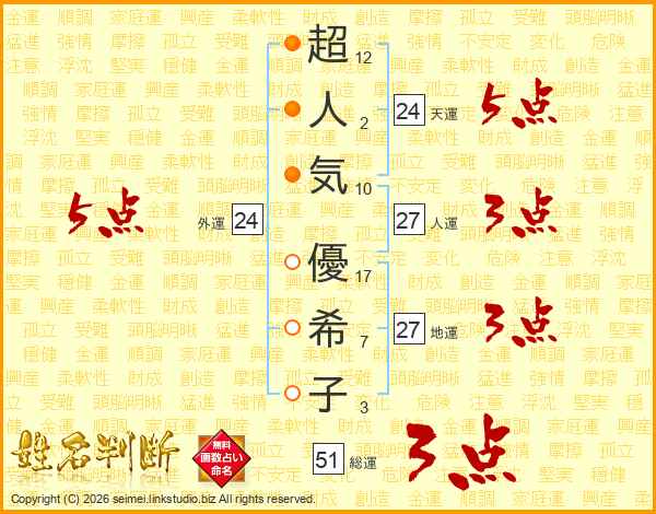 超人気優希子さんの総運は51画の3点!