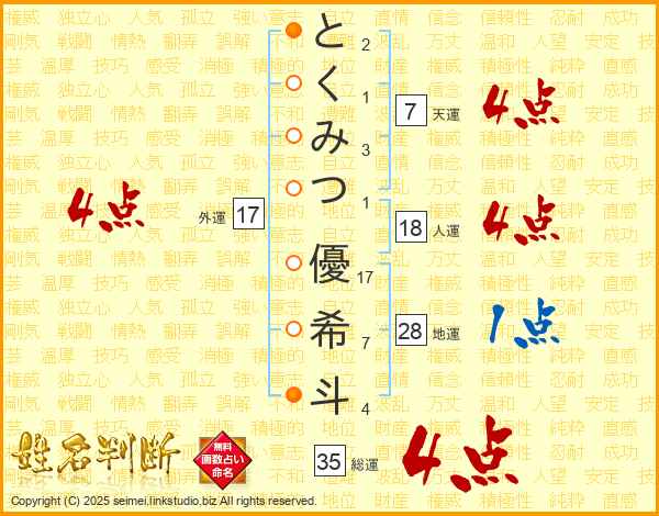 と(2画)く(1画)み(3画)つ(1画) 優(17画)希(7画)斗(4画)