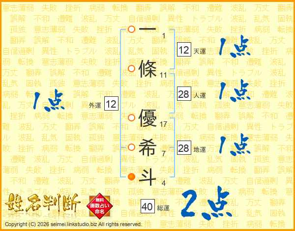 一(1画)條(11画) 優(17画)希(7画)斗(4画)