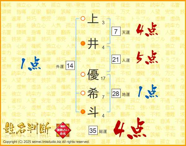 上(3画)井(4画) 優(17画)希(7画)斗(4画)