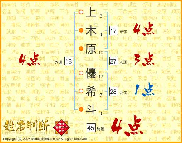 上(3画)木(4画)原(10画) 優(17画)希(7画)斗(4画)