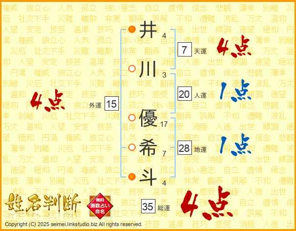 井(4画)川(3画) 優(17画)希(7画)斗(4画)