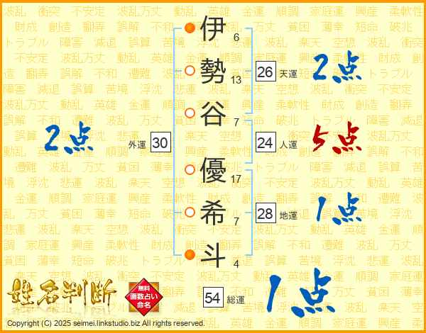 伊(6画)勢(13画)谷(7画) 優(17画)希(7画)斗(4画)