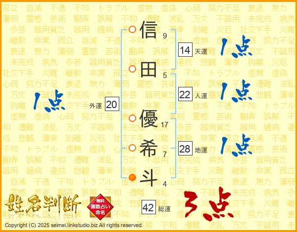 信(9画)田(5画) 優(17画)希(7画)斗(4画)
