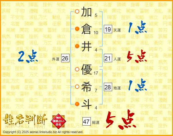 加(5画)倉(10画)井(4画) 優(17画)希(7画)斗(4画)