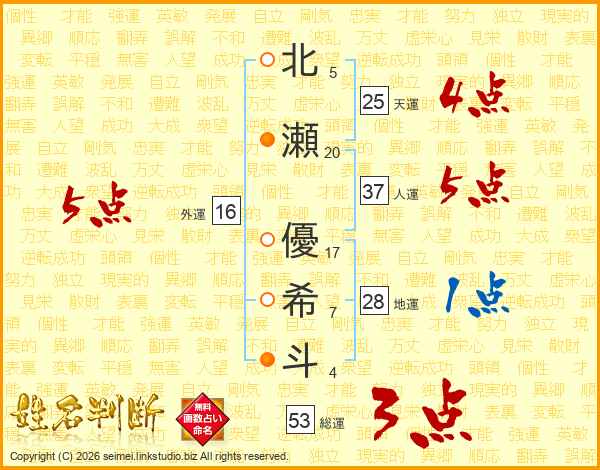 北瀬優希斗さんの外運は16画の5点!