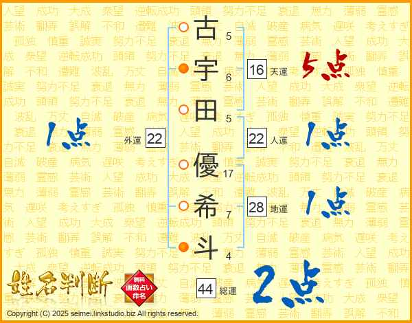 古(5画)宇(6画)田(5画) 優(17画)希(7画)斗(4画)