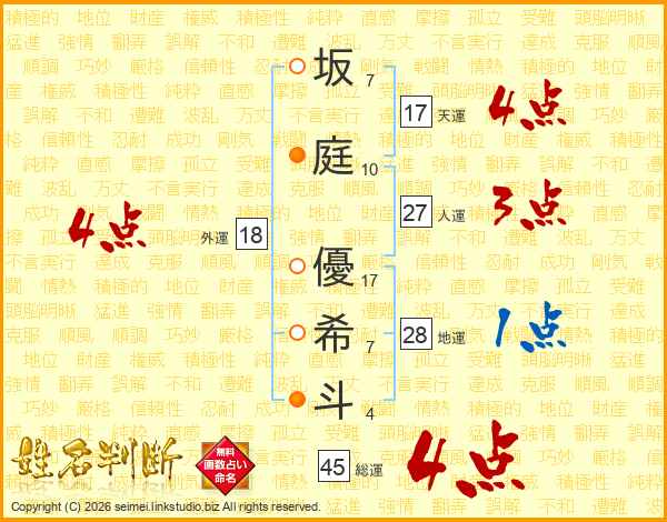 坂(7画)庭(10画) 優(17画)希(7画)斗(4画)