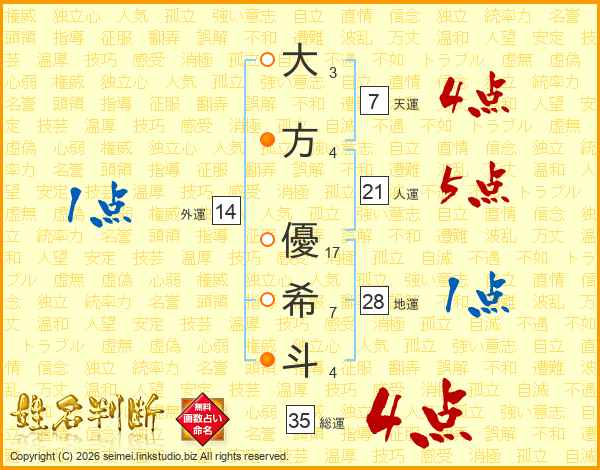 大(3画)方(4画) 優(17画)希(7画)斗(4画)