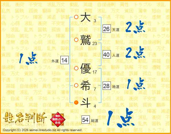 大(3画)鷲(23画) 優(17画)希(7画)斗(4画)