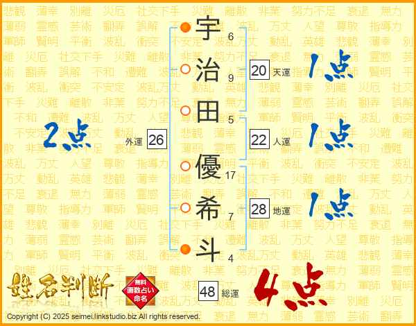宇(6画)治(9画)田(5画) 優(17画)希(7画)斗(4画)