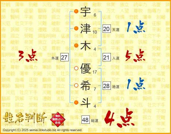 宇(6画)津(10画)木(4画) 優(17画)希(7画)斗(4画)
