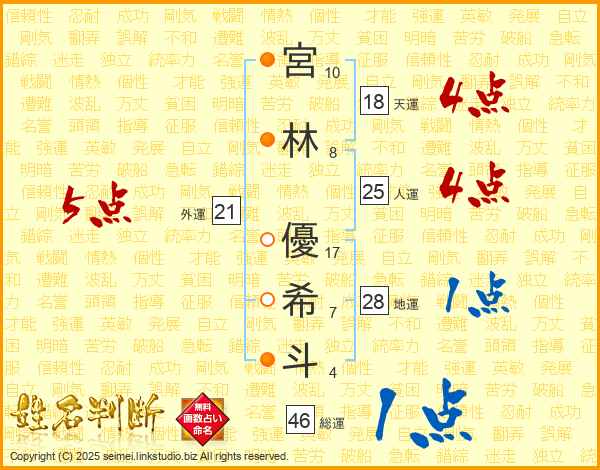 宮林優希斗さんの総運は46画の1点!