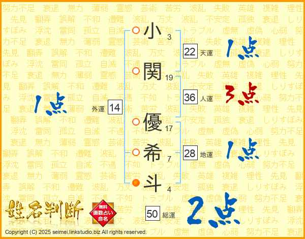 小(3画)関(19画) 優(17画)希(7画)斗(4画)