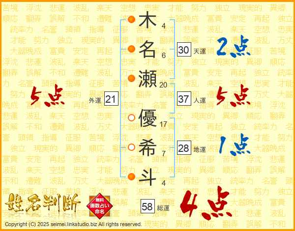 木名瀬優希斗さんの総運は58画の4点!