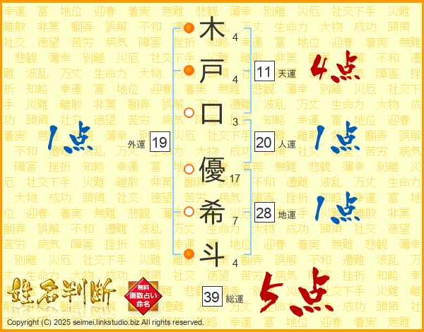 木(4画)戸(4画)口(3画) 優(17画)希(7画)斗(4画)