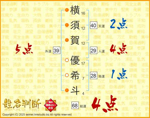横(16画)須(12画)賀(12画) 優(17画)希(7画)斗(4画)