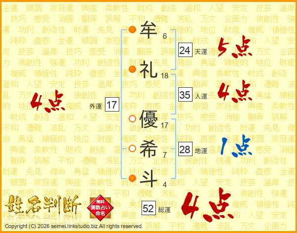 牟(6画)礼(18画) 優(17画)希(7画)斗(4画)