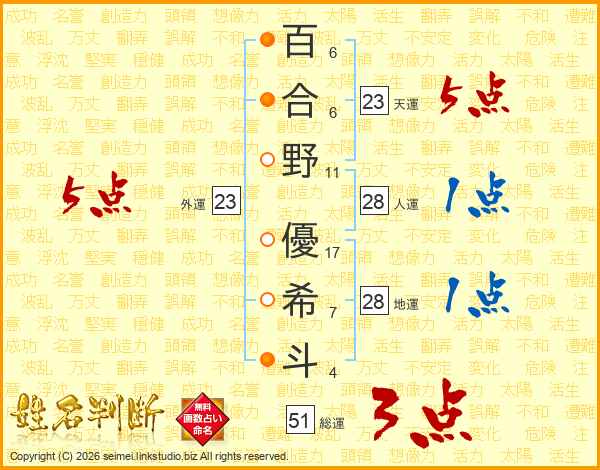 百(6画)合(6画)野(11画) 優(17画)希(7画)斗(4画)
