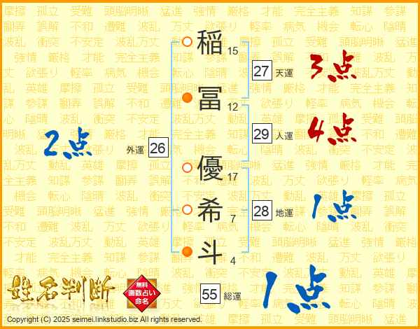 稲(15画)冨(12画) 優(17画)希(7画)斗(4画)