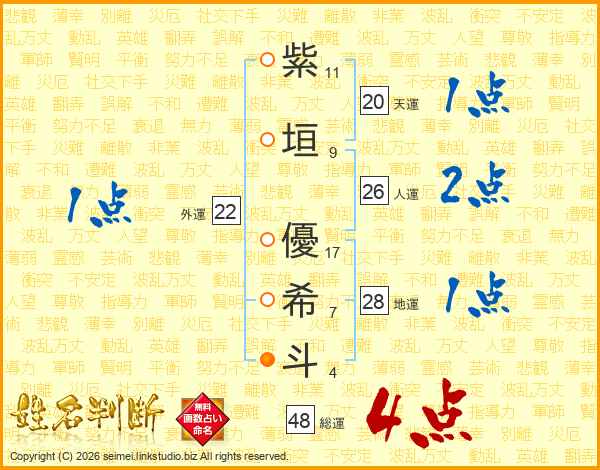 紫(11画)垣(9画) 優(17画)希(7画)斗(4画)
