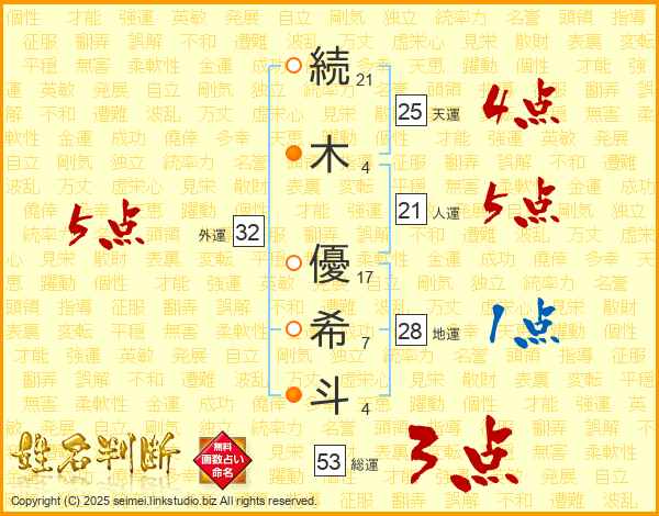 続(21画)木(4画) 優(17画)希(7画)斗(4画)