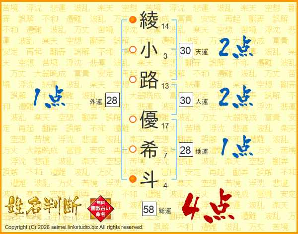 綾(14画)小(3画)路(13画) 優(17画)希(7画)斗(4画)