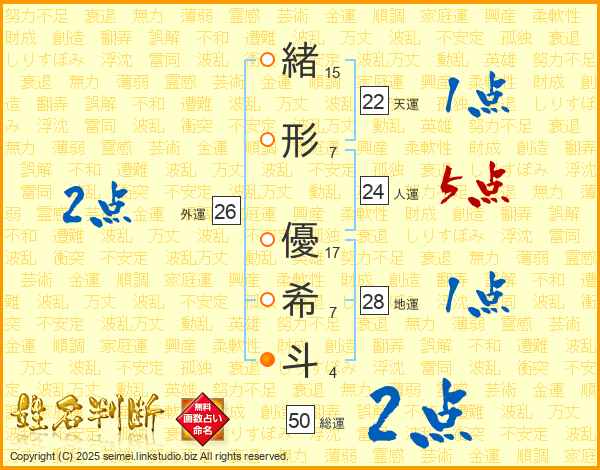 緒(15画)形(7画) 優(17画)希(7画)斗(4画)