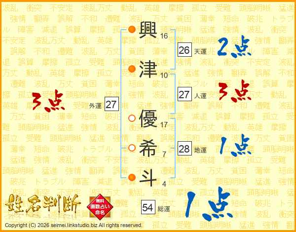 興(16画)津(10画) 優(17画)希(7画)斗(4画)