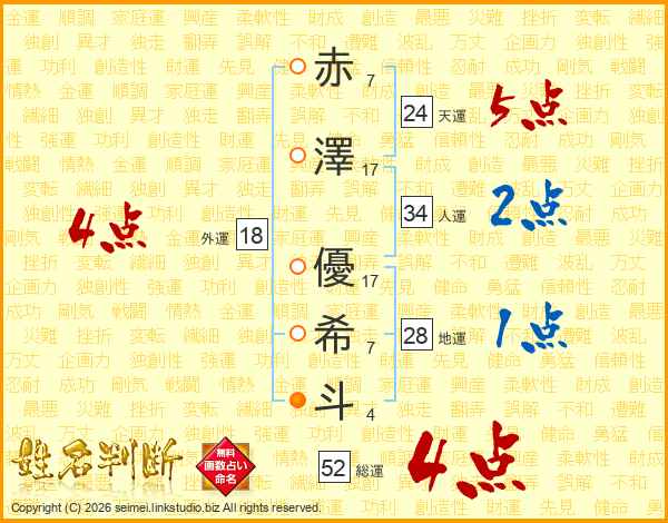 赤(7画)澤(17画) 優(17画)希(7画)斗(4画)