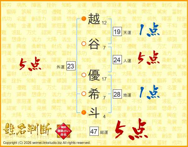 越(12画)谷(7画) 優(17画)希(7画)斗(4画)