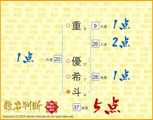 重優希斗さんの総運は37画の5点!