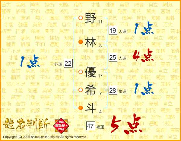 野(11画)林(8画) 優(17画)希(7画)斗(4画)