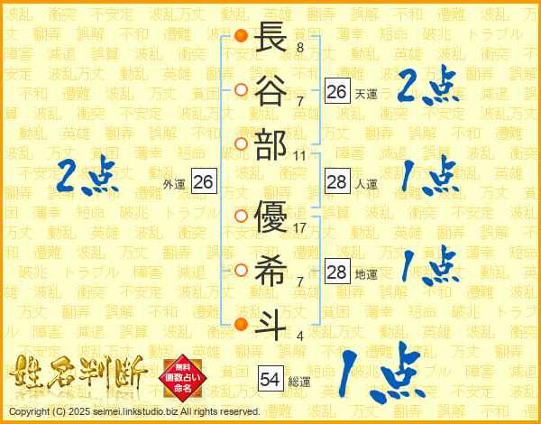 長(8画)谷(7画)部(11画) 優(17画)希(7画)斗(4画)