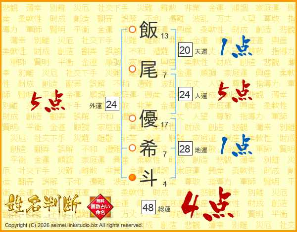飯(13画)尾(7画) 優(17画)希(7画)斗(4画)