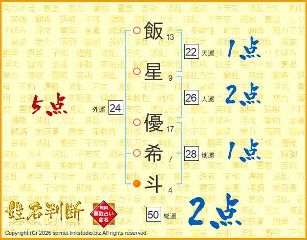飯(13画)星(9画) 優(17画)希(7画)斗(4画)