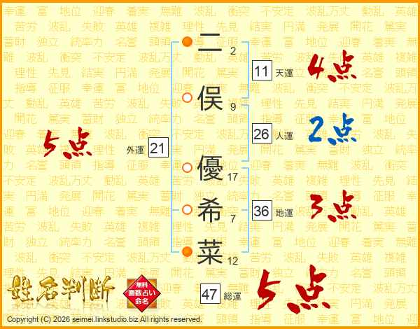 二(2画)俣(9画) 優(17画)希(7画)菜(12画)