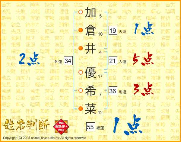 加(5画)倉(10画)井(4画) 優(17画)希(7画)菜(12画)