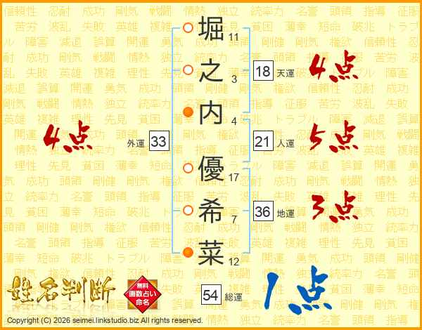 堀(11画)之(3画)内(4画) 優(17画)希(7画)菜(12画)