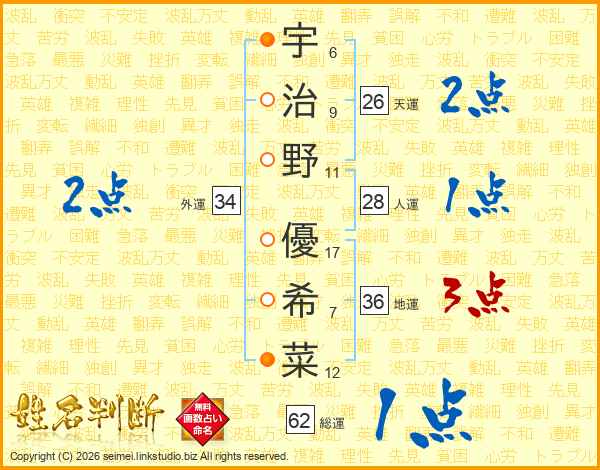宇(6画)治(9画)野(11画) 優(17画)希(7画)菜(12画)