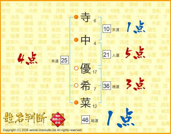 寺(6画)中(4画) 優(17画)希(7画)菜(12画)