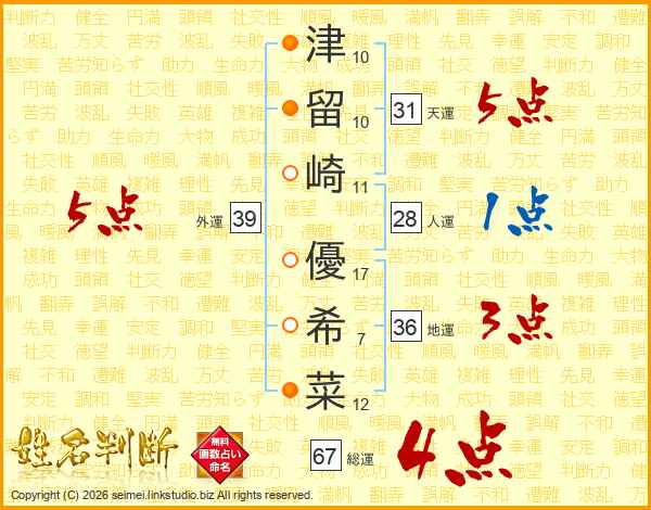 津留崎優希菜さんの外運は39画の5点!